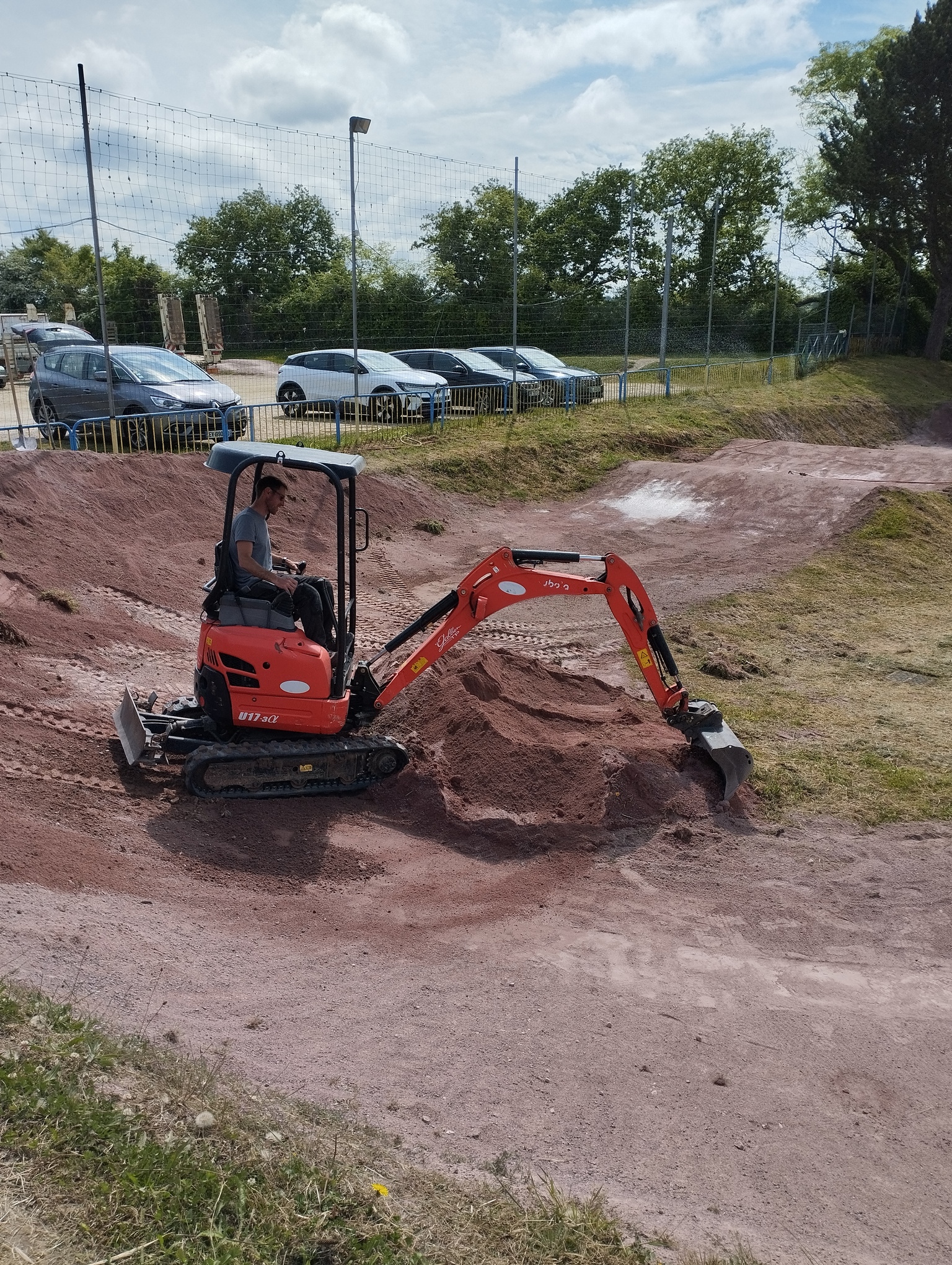 Le pont 9 au 11 Mai, propice au repos, a été l’occasion pour les membres du Cherbourg BMX de refaire une jeunesse à leur piste. Et on a sorti les gros moyens grâce au support de l’entreprise Gallien TP, pelle de 15 tonnes, mini pelle, cylindre , dumper, plaques vibrantes. La mairie de Cherbourg nous ayant mis à disposition au préalable du remblai et de la couche de finition.